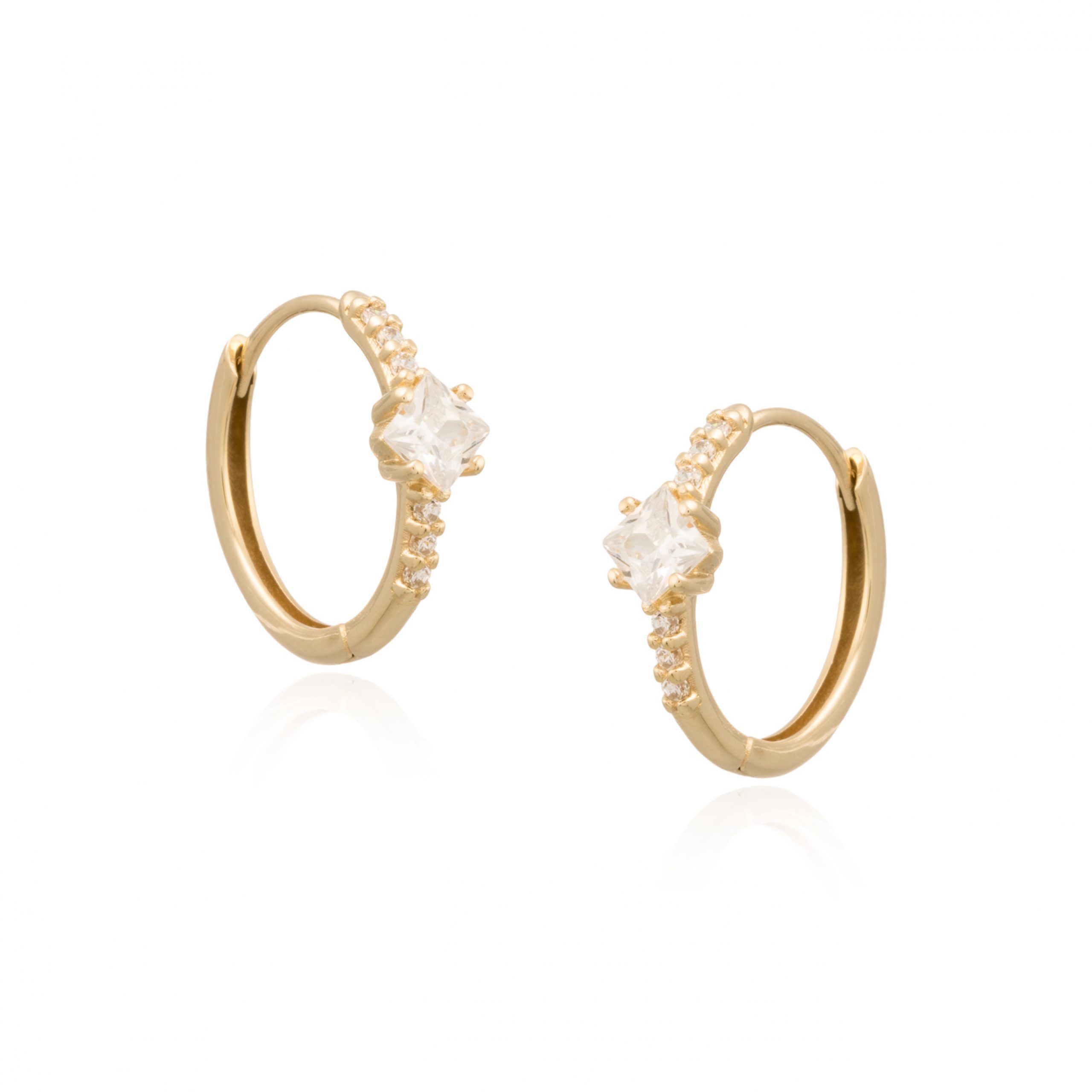 Pendientes Big Carré de aro pequeño en oro de 9 quilates con incrustaciones de una pieza carré de 3,5 mm y 6 circonitas de 1,20 mm, diametro de aro de 15,5 mm y ancho de 1,65 mm. Se venden por par o por unidad.