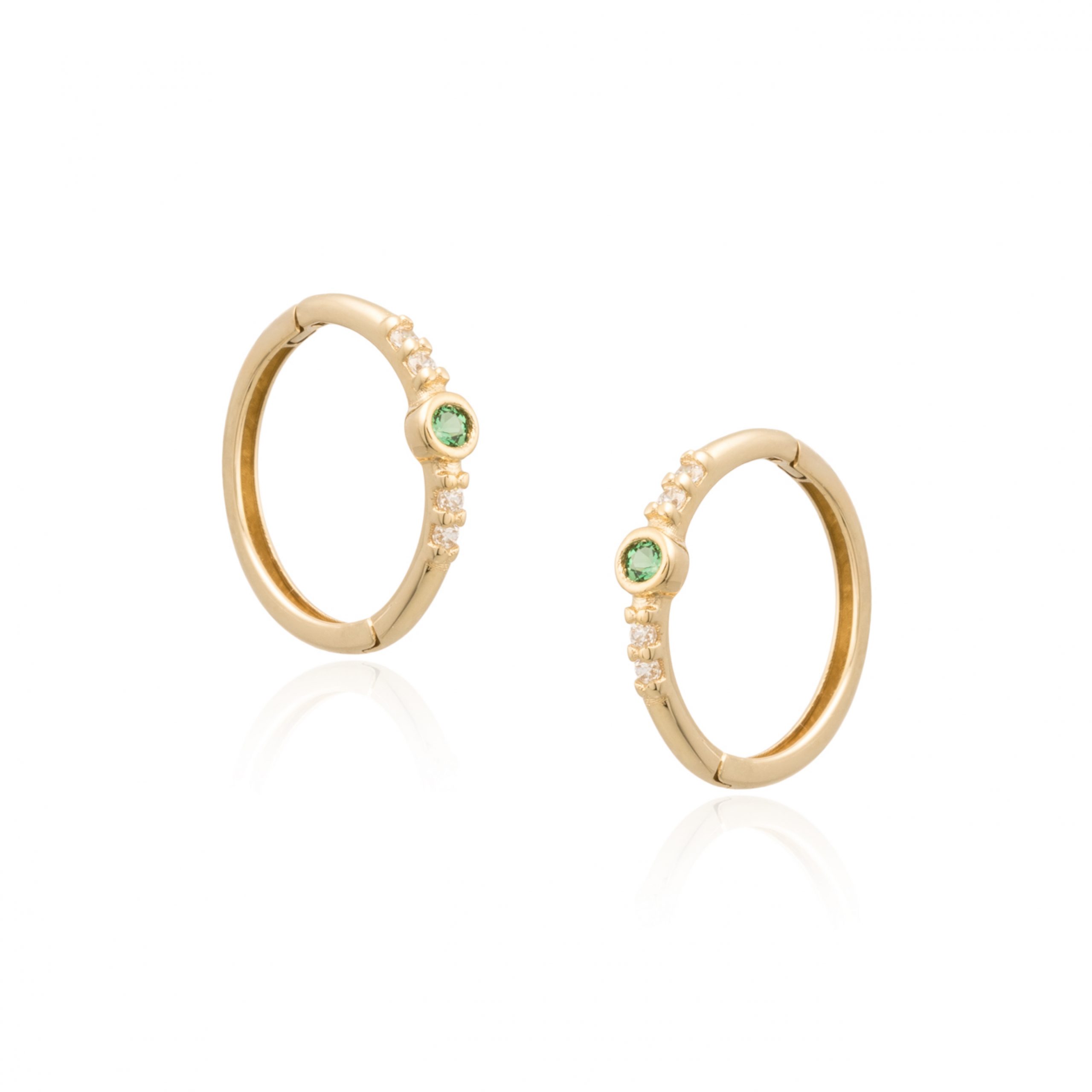 Pendientes N-Green de aro pequeño en oro de 9 quilates con incrustaciones de nanogreen de 1,60 mm y 4 circonitas de 1 mm, dimensión aro de 12 mm de diámetro. Se vende individual y par.