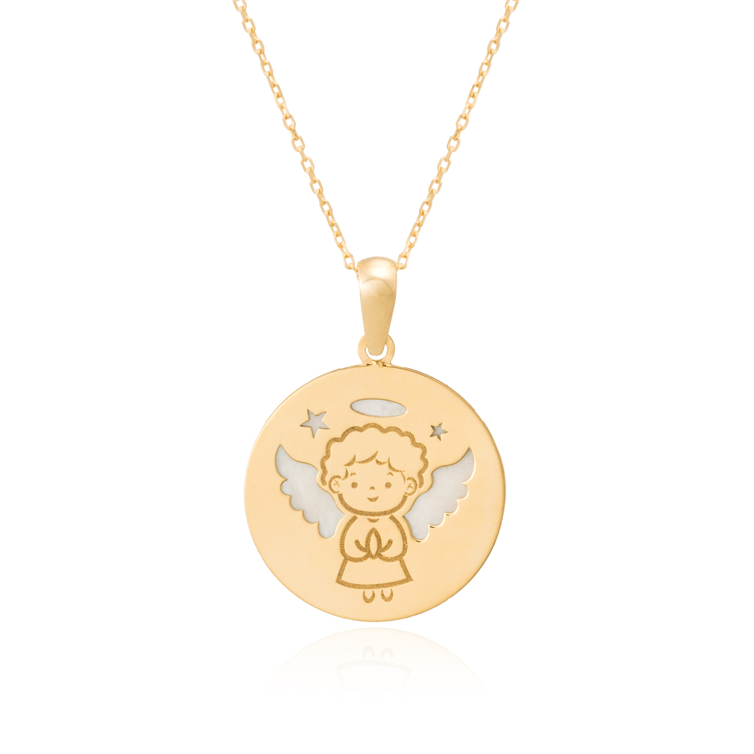 Colgante Ángel en oro amarillo disponible en 18 quilates con incrustaciones de nácar, con 20 mm de diámetro. Cadena no incluida.