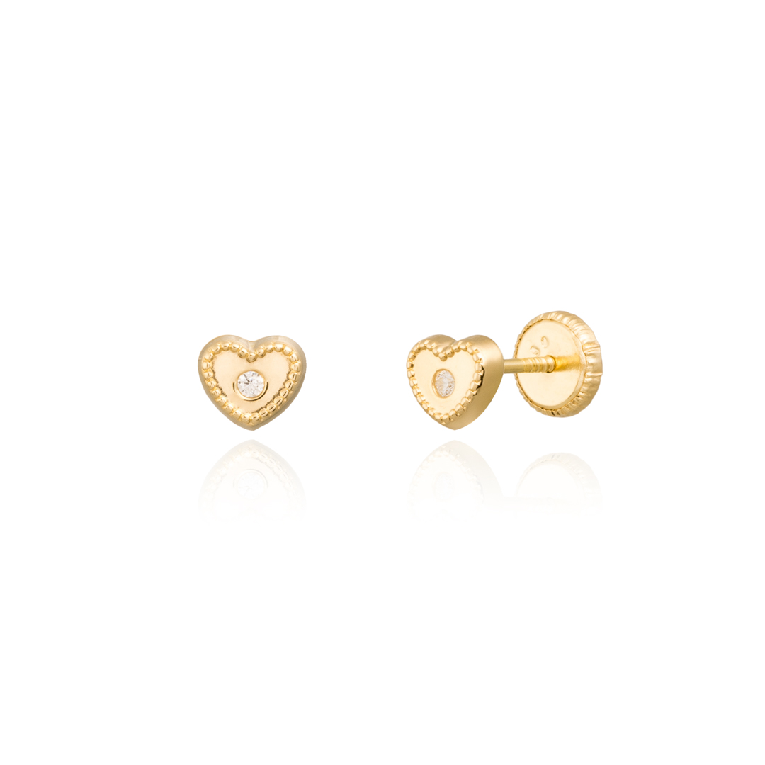 Pendientes Kids Heart para niña en oro 18 quilates con forma de corazón de 7 mm y aplicación de circonita de 1 mm. Incluidas tuercas.