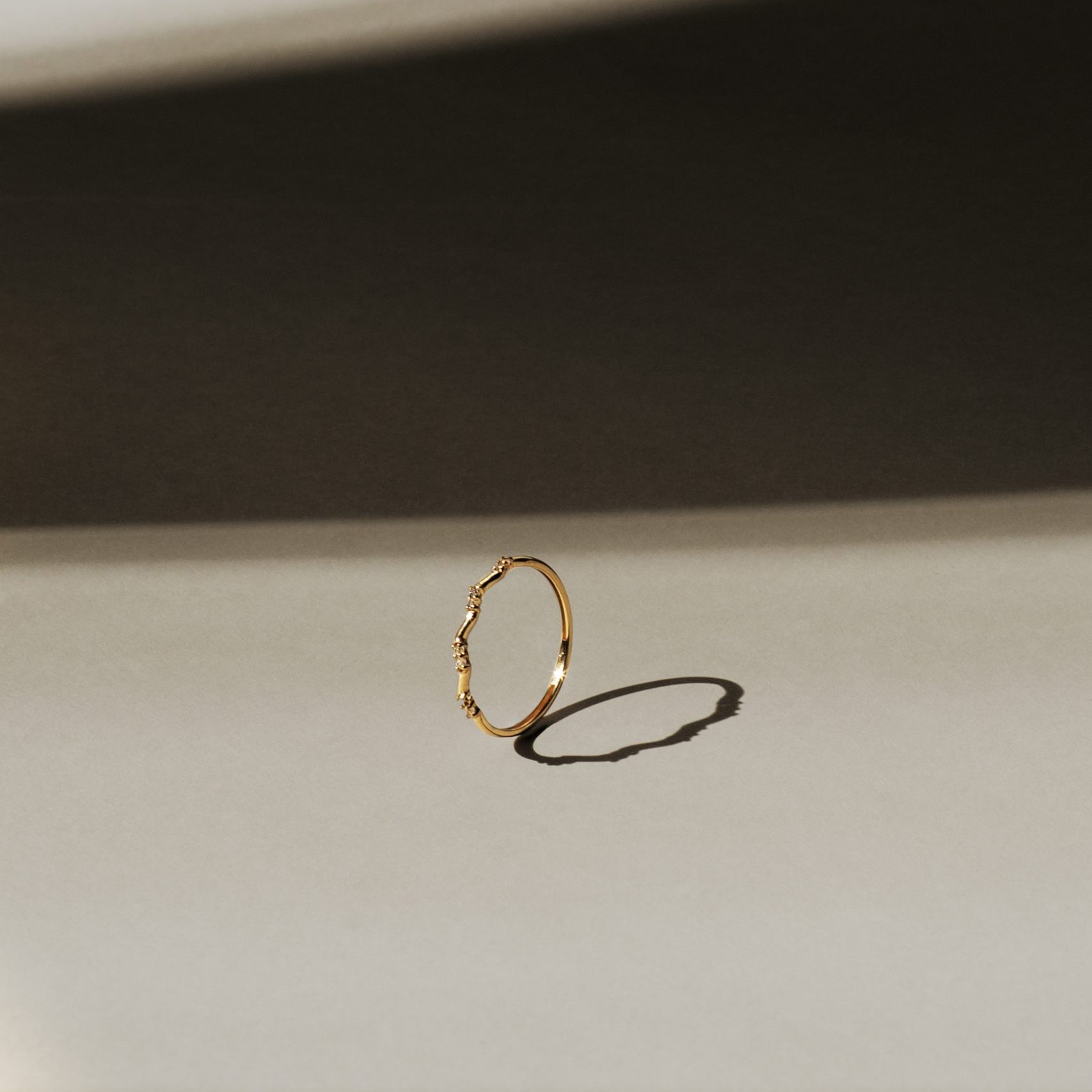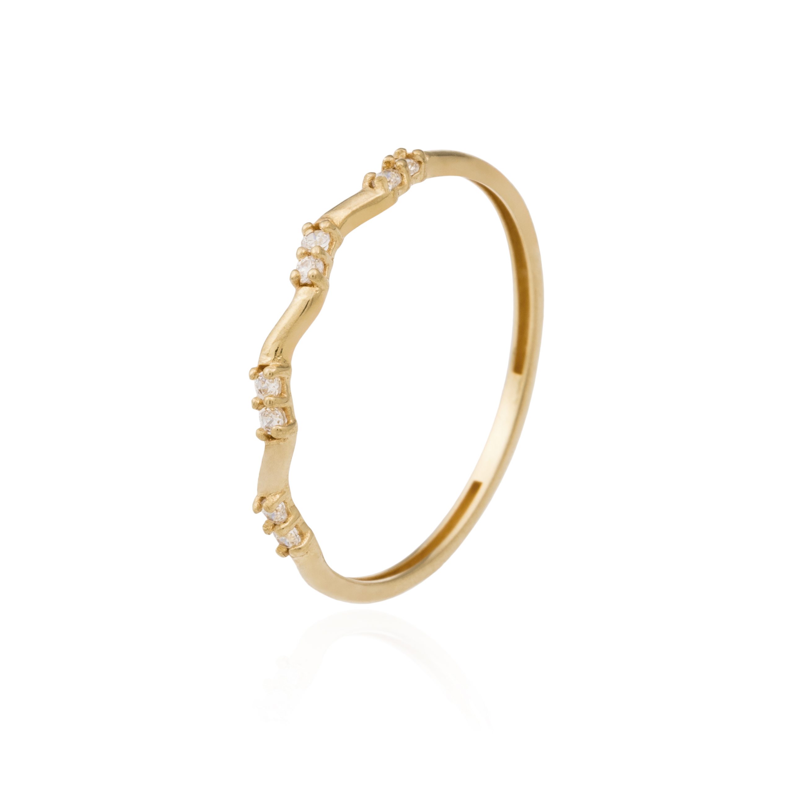 Sortija Irregular en oro amarillo de 18 quilates con incrustaciones de 8 circonitas 1,20 mm. Disponible en todas las tallas.
