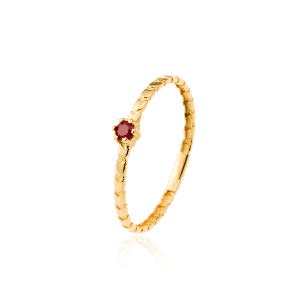 Sortija fabricada en oro amarillo de 9 quilates con aplicación de piedra preciosa rubí de 2,50 mm, perfecta combinación de juego de tres. Dimensiones de anillo motivo 3,40 mm grosor y cuerpo 1,40 mm. Disponible en diferentes tamaños.